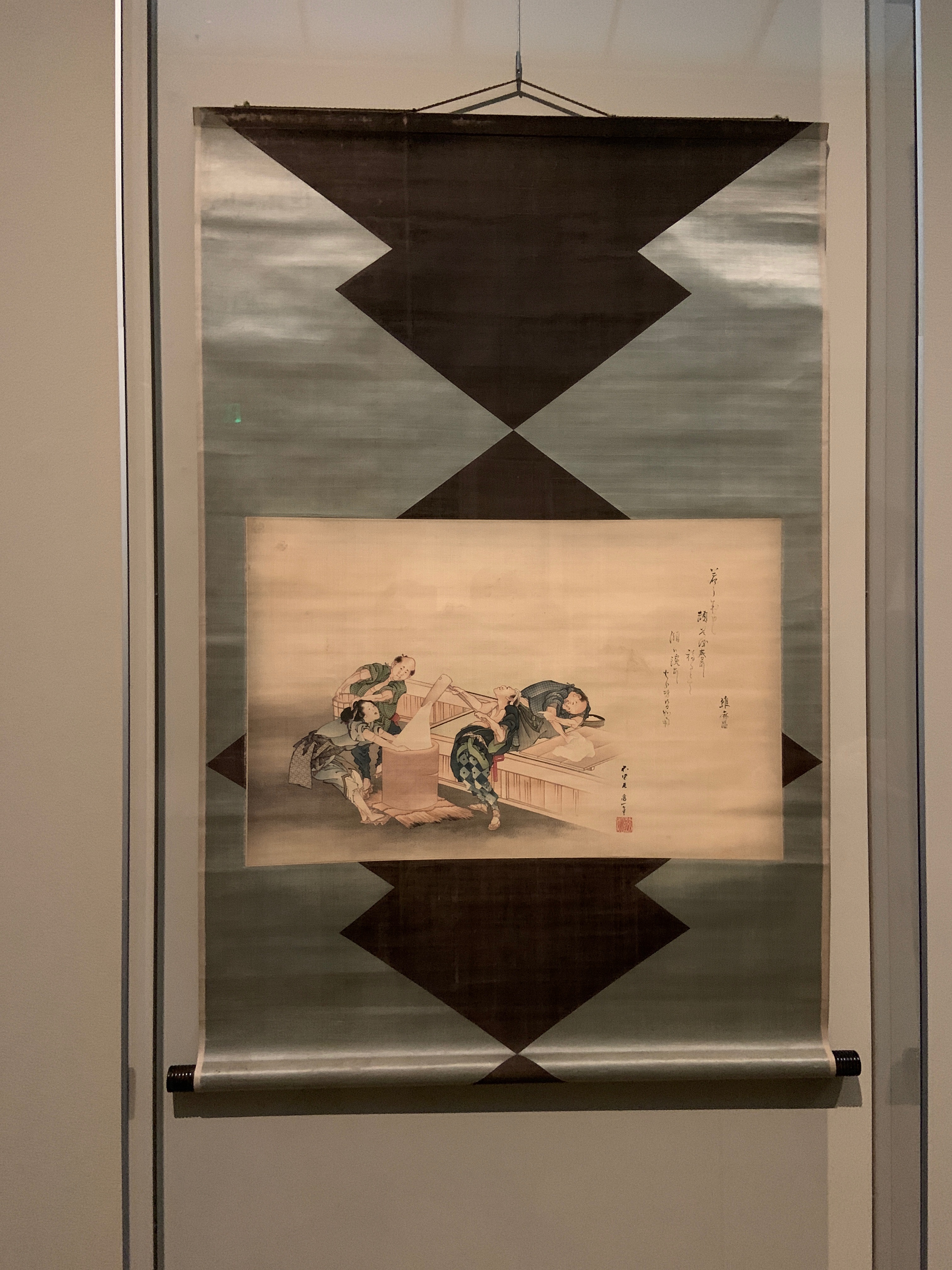 Out of the Freer archives comes a very rare piece. The scroll “Pounding Rice for Mochi” shows two men and two women at work. What makes this so special? The cloth on the top and bottom are original dating back to circa 1822, showing very different designs. Most scrolls have been re-mounted on newer silks as the original fabric deteriorates.