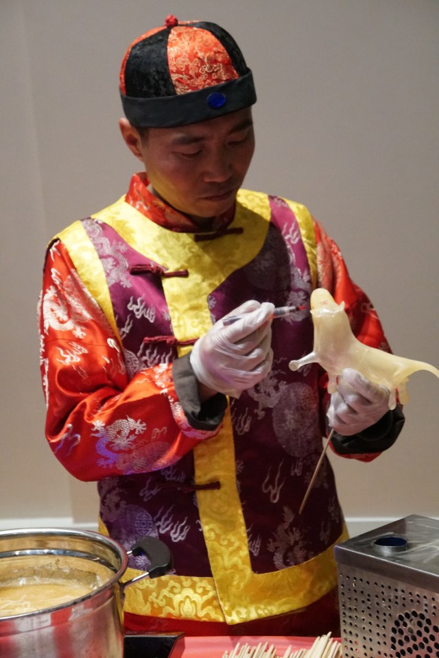 A Chinese finger painter, Hao Da Wei, painted characters on red paper and autographed, with his chop, his small painting. Of particular fascination to the children, and accompanying adults, was the candy blower, who created sugar rats, handing them out on sticks.