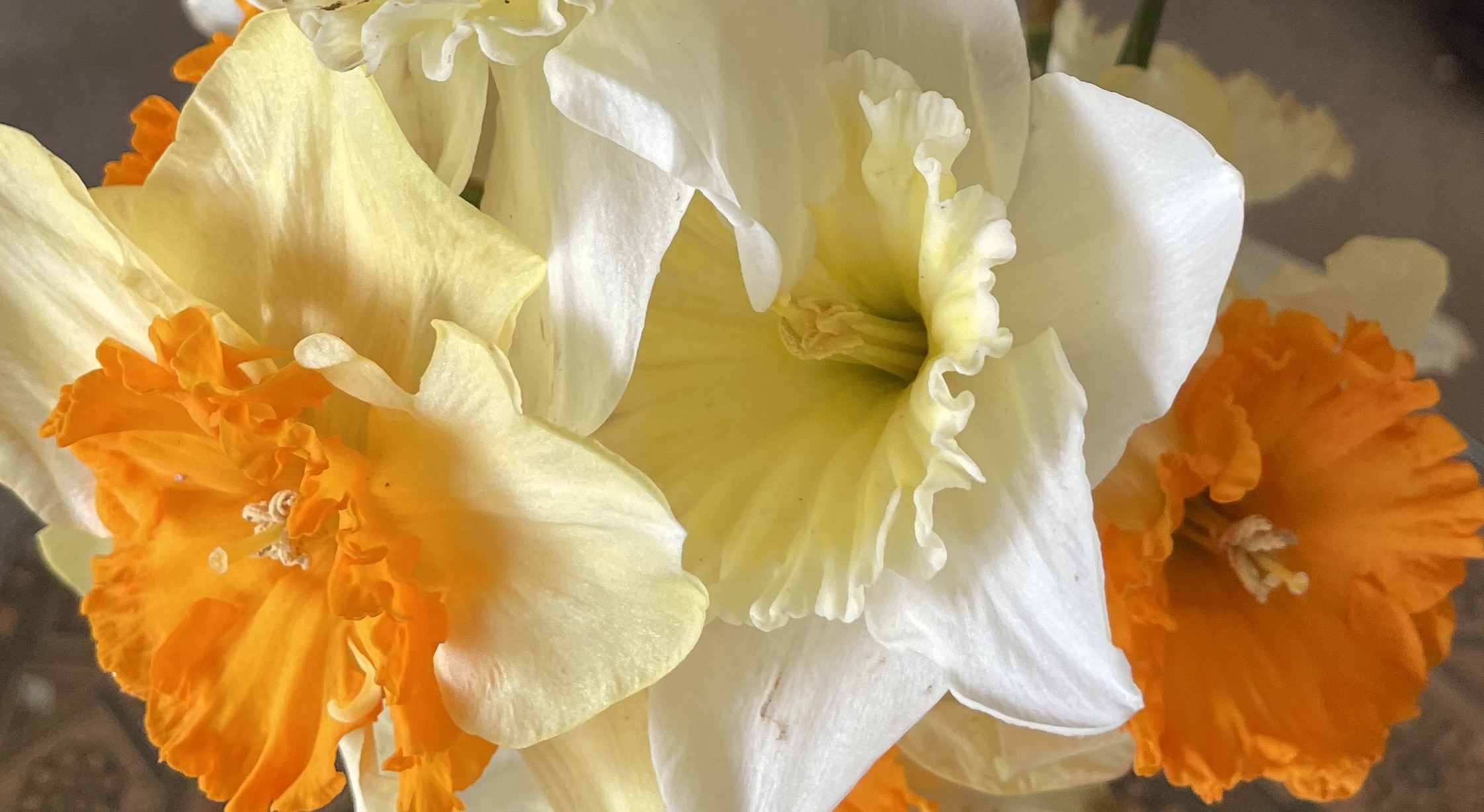 What I noticed the wary, but determined gaze, of his daughter. Tightly held In her arms, was a water-filled pressed glass vase and a bunch of flowers – daffodils, purple Iris, and tulips, obviously carefully chose by the family from the display at Whole Foods. That daughter wasn’t going to let anything happen to the bouquet for Mom.