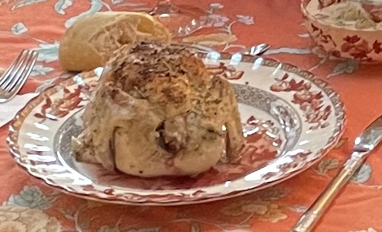 We also discovered that the hen defrosting hadn’t been total. No problem. A bird-filed plate fits nicely in the microwave. Two minutes. Perfect.