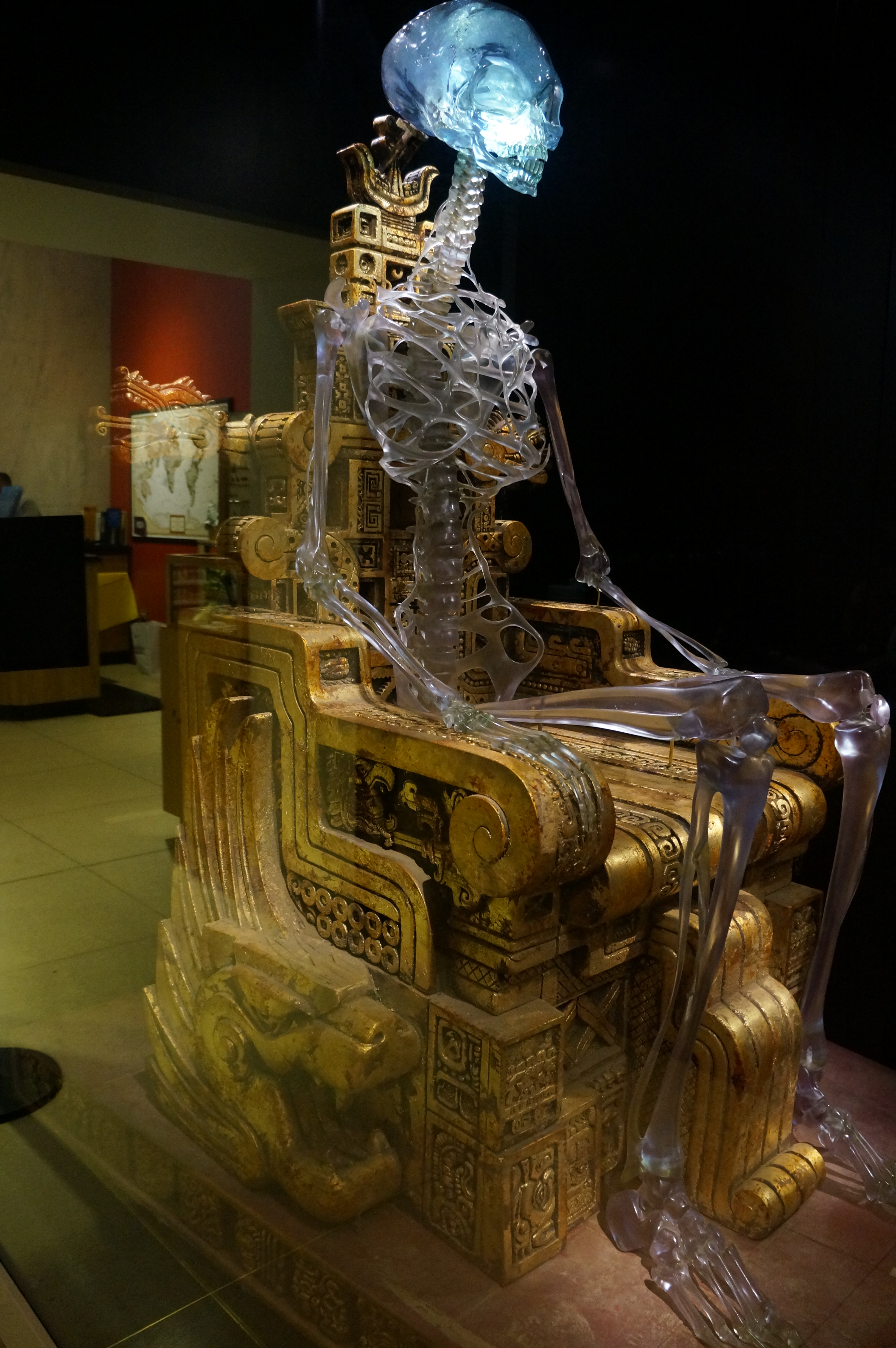 A seated skeleton from “Indiana Jones and the Kingdom of the Crystal Skull” is part of ndiana Jones and the Adventure of Archaeology exhibit. May 14-Jan. 3, 2016 at National Geographic in Washington, D.C.