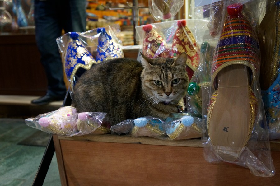 A beloved cat with glittering collar sits amid slippers in the Ottoman Art store on the istiklal Caddesi