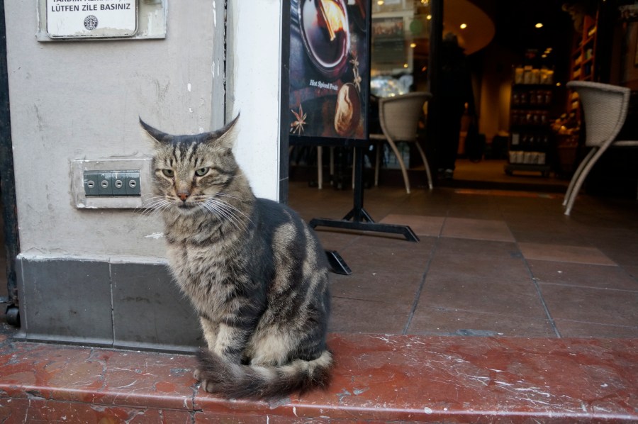 A cat outside of Starbucks on the Istiklal Caddesi in Istanbul, Turkey, 11/9/15