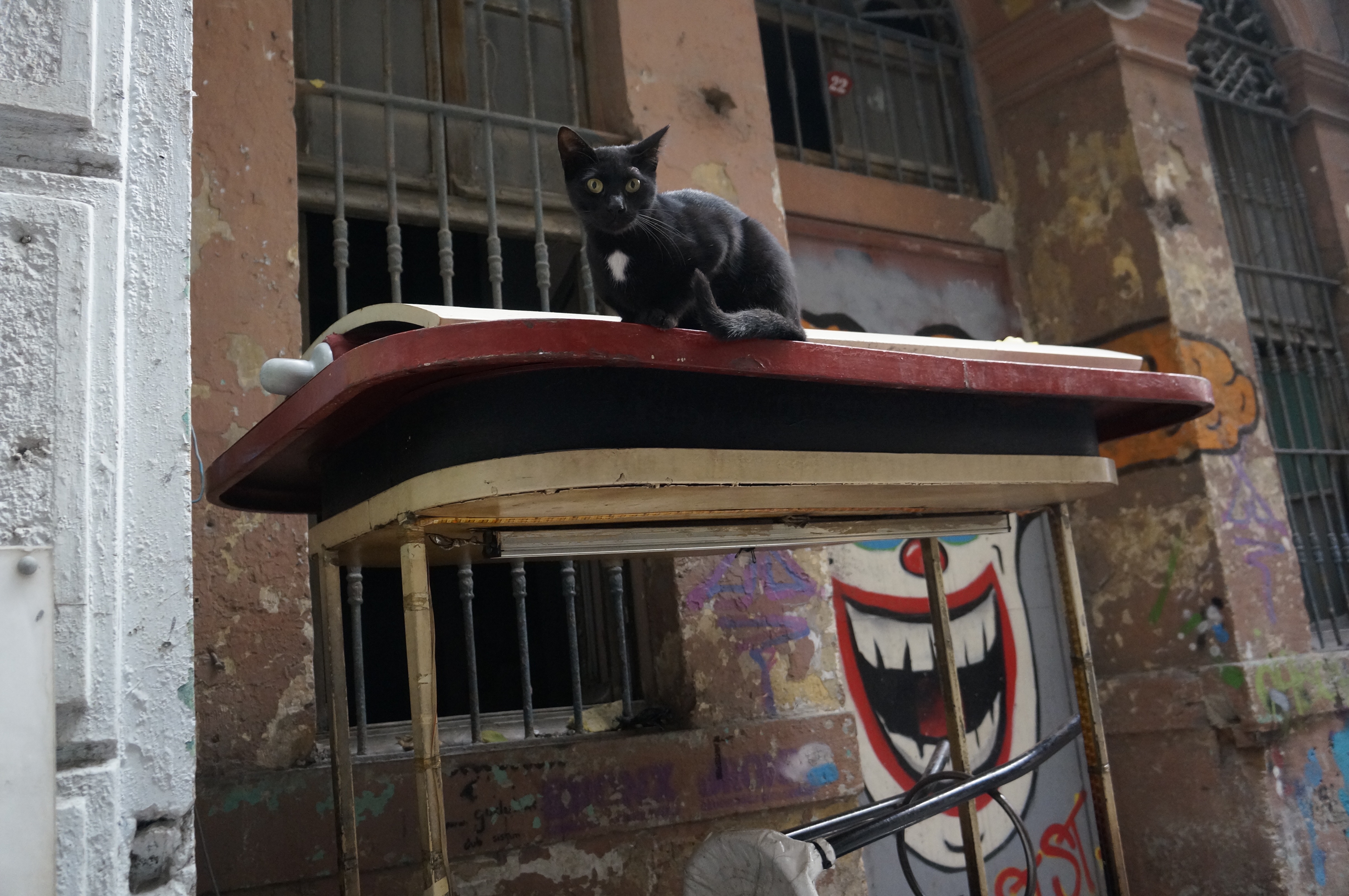 Against a backdrop of graffiti and art, a hungry half-grown cat looks for breakfast just off the Istiklal Caddesi