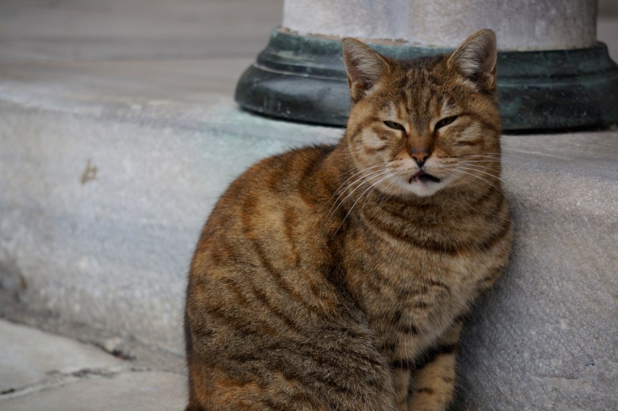 A cat sits near the Beautiful Gate outside Aya Sofia in Istanbul, Turkey, 11/7/15