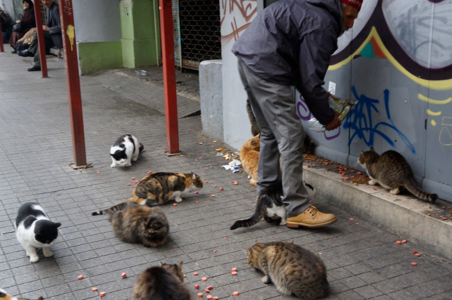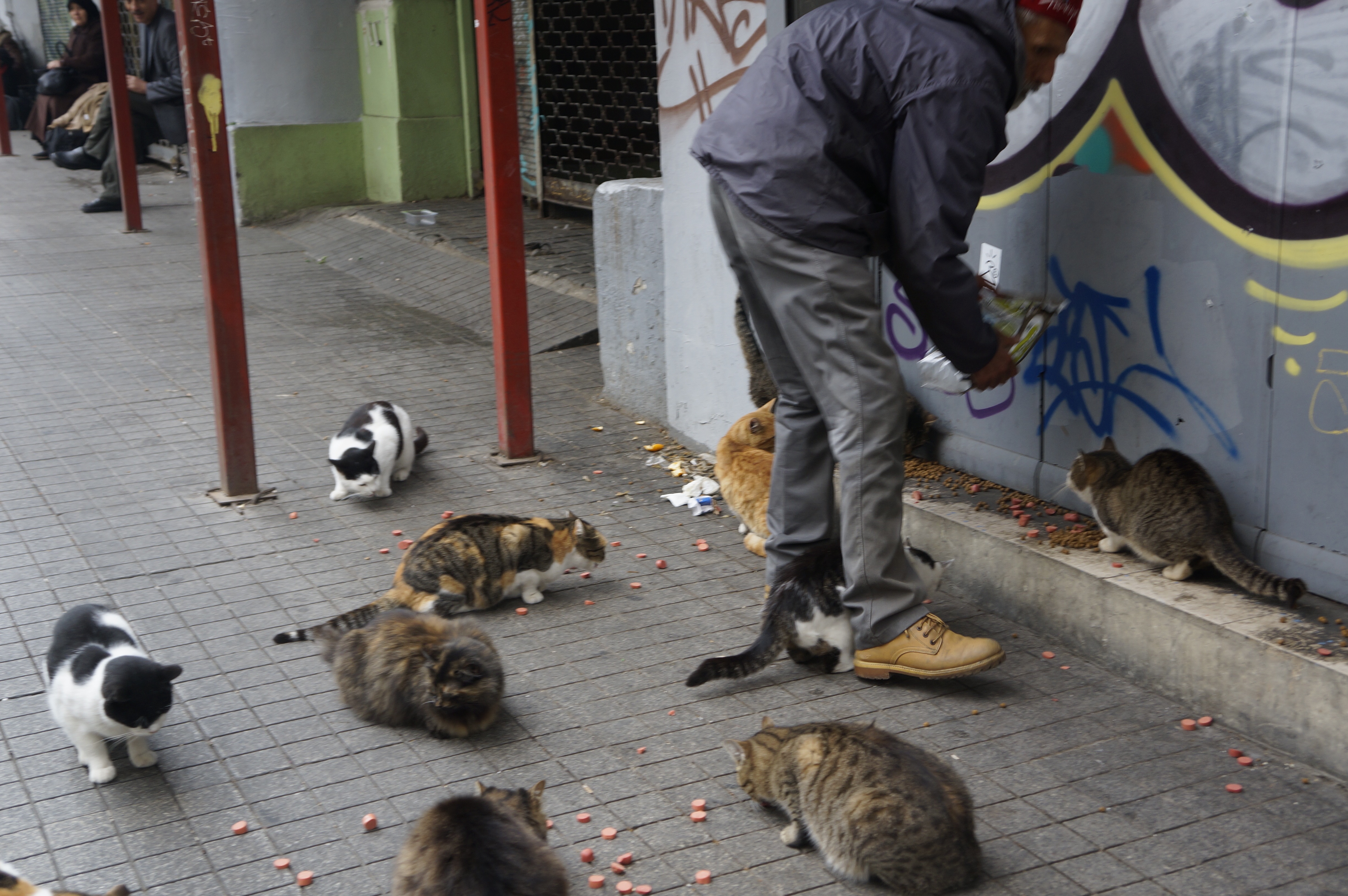 Man feeds cat colony along the Istiklal Caddesi in Istanbul, Turkey, 11/9/15