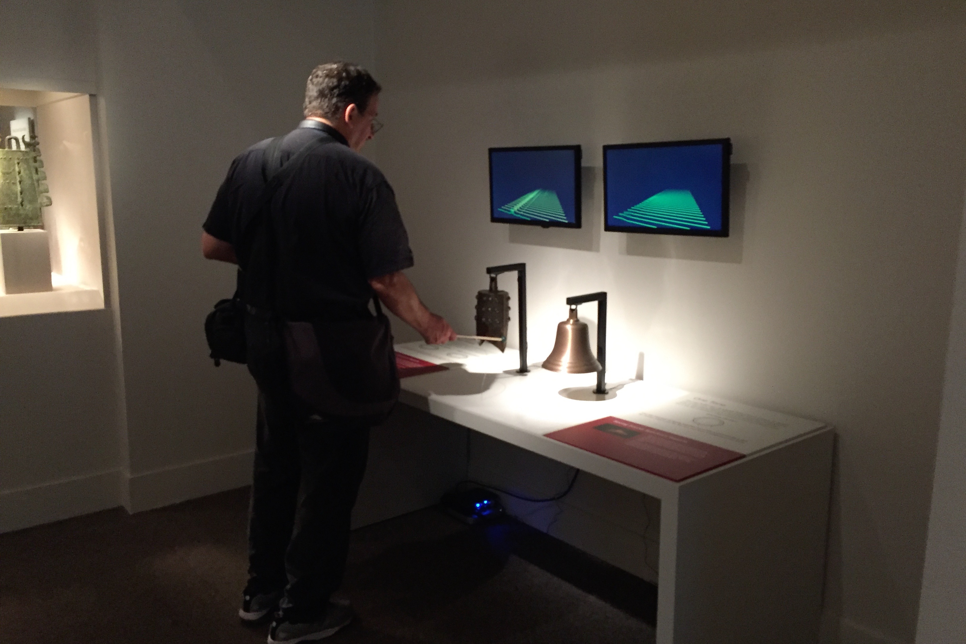 What is the most striking is the interactive aspect of the exhibit. Two tablets on one wall show the difference in the ring of the bells, Chinese and European, through the different pitches.