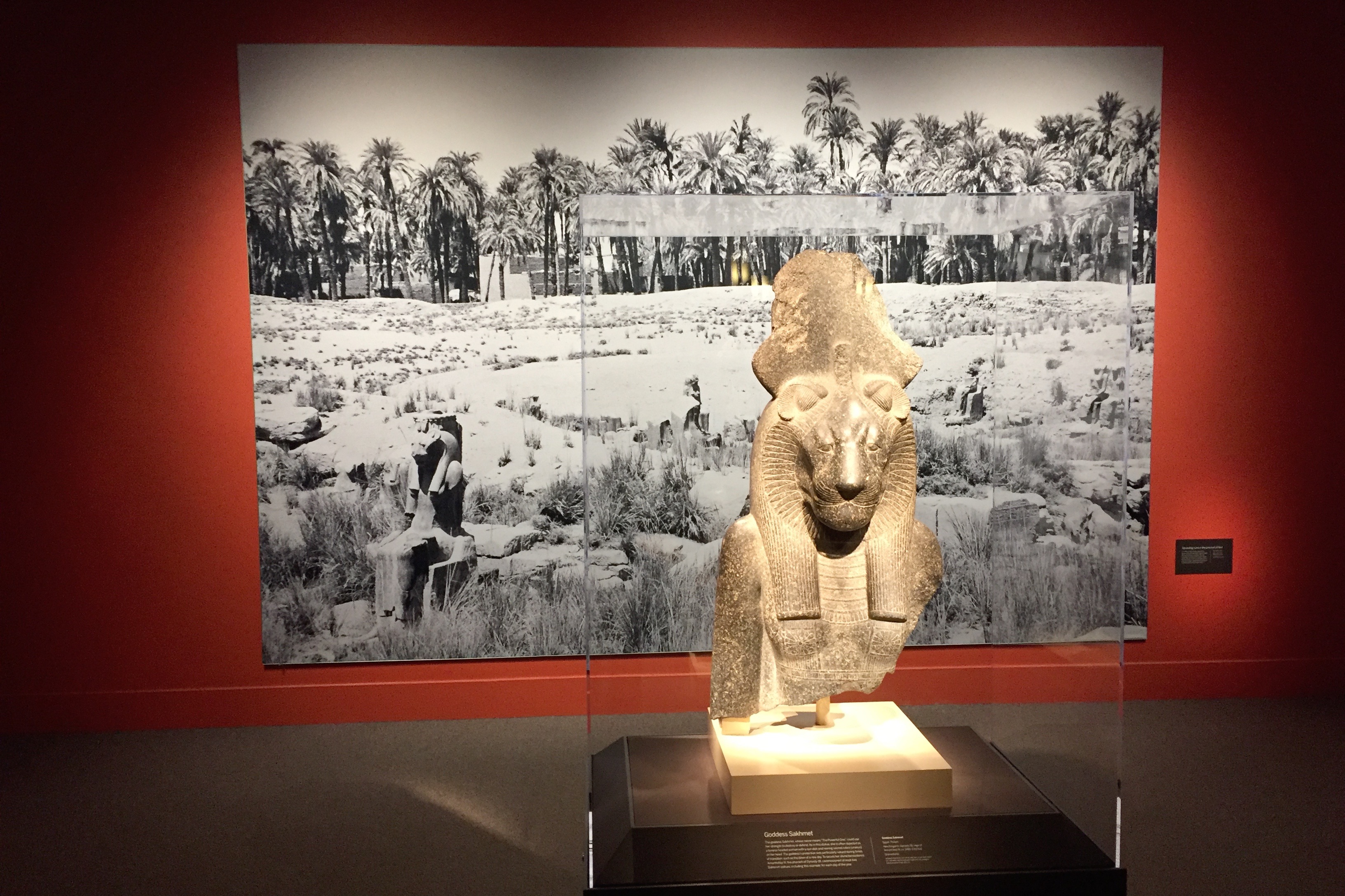 According to the exhibit, she was “believed to guard worshipers against snakes and scorpions and to fiercely protect the pharaoh and the gods.”