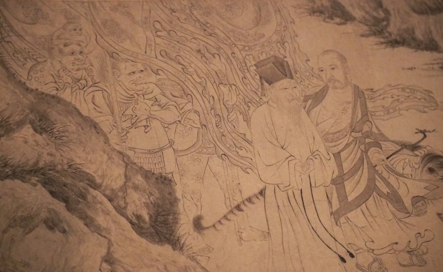 Details of the only existing work by Fanlong (12th century). A Confucian, a Buddhist Luohan, a tiger, and earth demons.