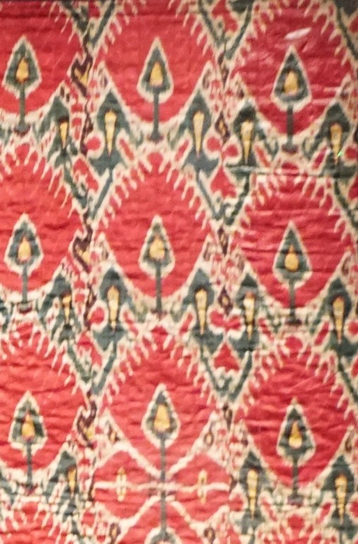 The word ‘Ikat” is actually a Malaysian-Indonesian word that means “to tie” bundles of thread. It has become a generic term for the designs, said Chief Curator Massumeh Farad, of the Freer Gallery of Art and the Arthur M. Sackler Gallery. “In Central Asia the term used is ‘Cloud Binding’.” Ikats are produced in India, Indonesian and Japan, but the Central Asian ikats are known for their “incredible color and palette and bold designs.”