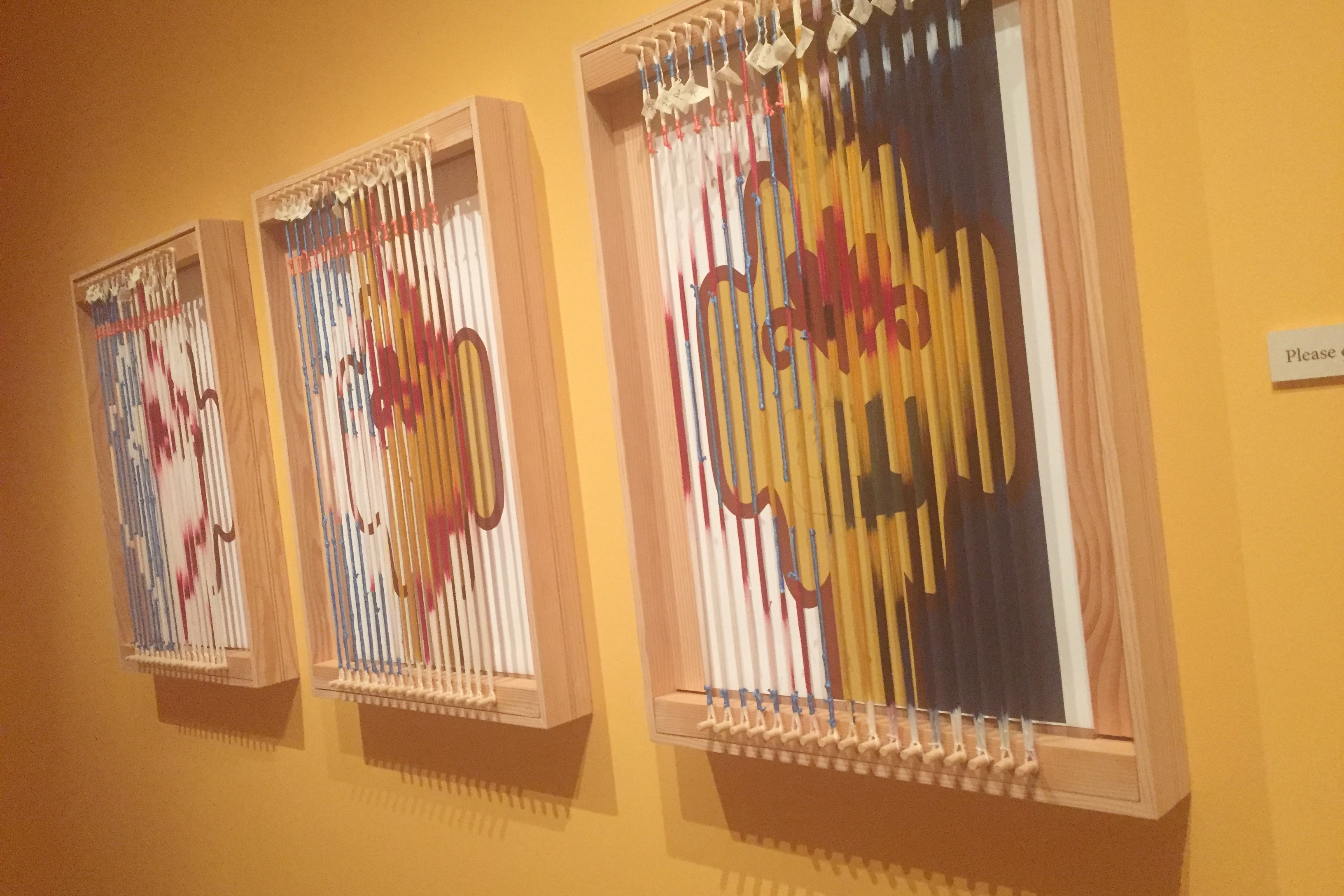 The process of making an ikat is laborious. The designs, with pomegranates, jugs and others, are created long before the actual weaving is begun. The threads are dyed from light to dark, usually starting from yellow to the red to indigo. At George Washington’s The Textile Museum, which also has a ikat exhibit, “Binding the Clouds: the Art of Central Asian Ikat,” The Maryland Institute College of Art, Baltimore, has constructed several examples of looms strung with dyed yarn which shows the complications of the weaving.