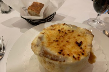 I started with ‘Onion Soup Les Halles.’ The only flaw in this was that the soup under the well-melted cheese topping was filled to the brim and spilled as soon as I put a spoon in.