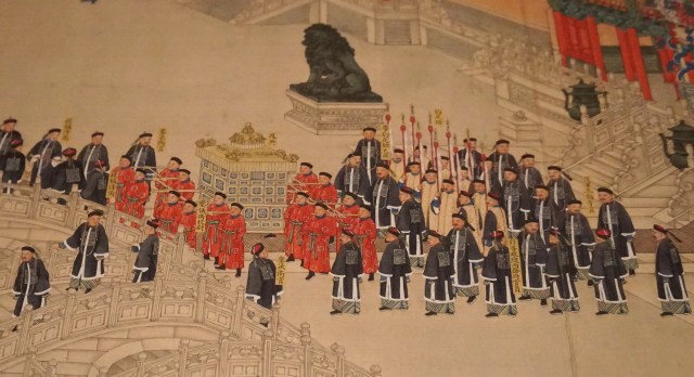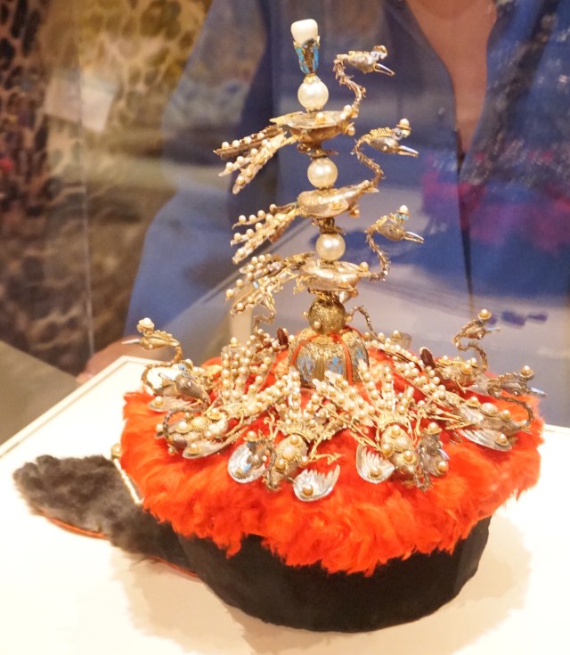 In contrast, two hundred years earlier, the Empress Xiaozhuang is dressed in a simple brown robe. Her throne has dragons and phoenixes which indicated a satisfying, happy marriage. Her long sleeves have “horse hoof” style cuffs, mandated for Manchu royalty.