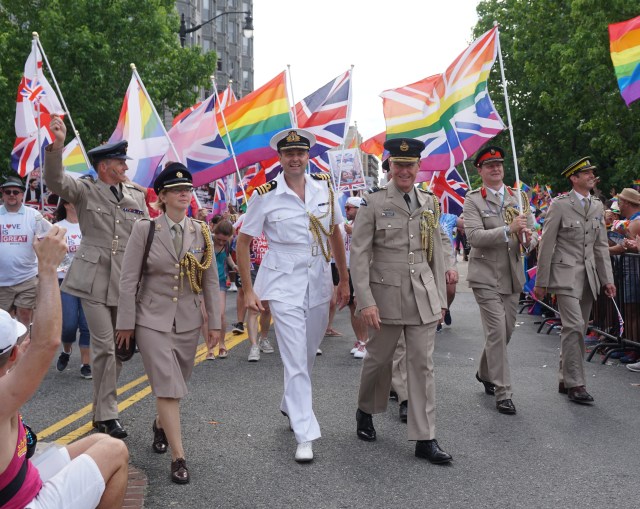 The Parade started with military flags. Local politicians went by. Then international: Costa Rica, the EU, the South Asian community, Ireland, Nordic countries. The UK had a stunning float. They also had military officers leading their group.
